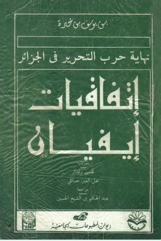 الكتاب: بن يوسف بن خدة: “نهاية حرب التحرير في الجزائر، إتفاقيات إيفيان”، تعريب لحسن زغدار، ومحل العين جبائلي، مراجعة عبد الحكيم بن الشيخ الحسين، ديوان المطبوعات الجامعية، الجزائر العاصمة، الجزائر، سنة 1986، من 141 صفحة.