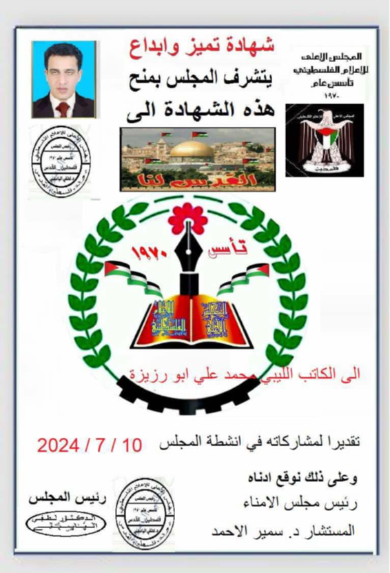 شرفٌ وفضلٌ وكرمٌ من أهله يغمرني فأعتز به وأفخر ، من فلسطين الحبيبة ، ومن عاصمتها الأبدية القدس الشريف ، ومن رجال صدقوا ماعاهدوا الله عليه وما بدلوا تبديلًا ، مُنِحْتُ شهادة ” التميز و الإبداع ” فكل العمر شكرًا و تقديرًا و عرفانًا لكم شعبًا و وطنًا وأبطالًا عانقت تضحياتهم عنان السماء ، وكل الشكر والتقدير والإخلاص والوفاء للمجلس الأعلى للإعلام الفلسطيني برئاسة أستاذي ومعلمي الغالي ، عميد الشعراء والكتاب والأدباء و المجاهدين العرب وصقر القدس الشريف الشيخ الدكتور / لطفي عقل الياسيني ، وأستاذي الغالي رئيس مجلس الأمناء بالمجلس المستشار الدكتور / سمير الأحمد ، و نائب رئيس المجلس الدكتورة / ليلى عريقات ، بارك الله فيكم وفي علمكم وكفاحكم المشرف من أجل الحرية التي أمتزجت بأرواحكم و دمائكم و بنادقكم وأقلامكم طوال مسيرتكم النضالية الخالدة ، وأشكركم على فيض كرمكم ورقيكم وتواضعكم وشهامتكم الدائمين ، وشهائدكم التي لا تقدر بثمن عندي هي منحةً غالية من فرسان غاليين أتشرف بها طوال عمري .