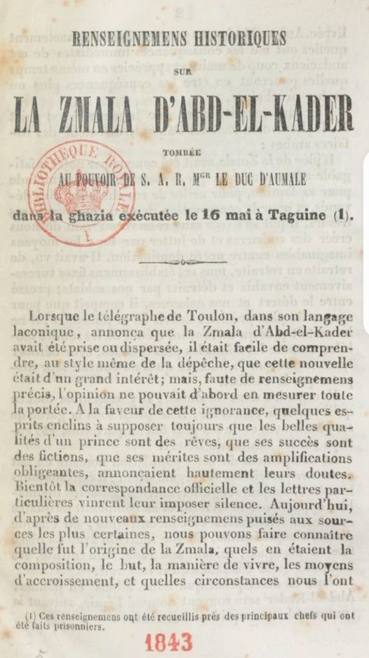 لاأشكّ لحظة أنّ استيلاء الاستدمار الفرنسي على زمالة الأمير عبد القادر تعادل من حيث الفرحة، والنصر، والنشوة، والافتخار فرحة فرنسا المجرمة، وافتخارها باحتلال الجزائر سنة 1830.
