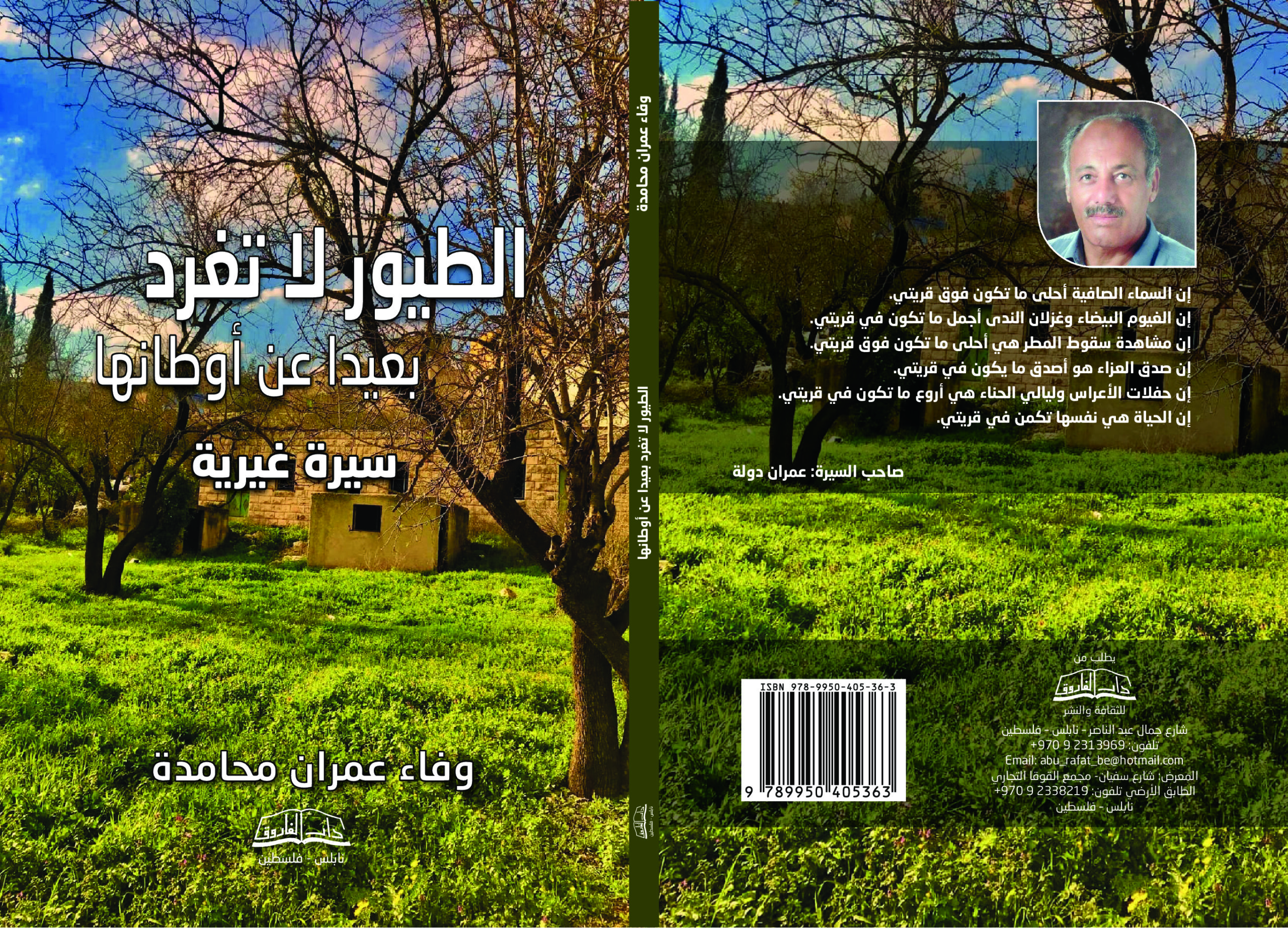 صدر مؤخراً عن دار الفاروق للثقافة والنشر في نابلس للأديبة الفلسطينية وفاء عمران محامدة كتاب جديد بعنوان: “الطيور لا تغرد بعيداً عن أوطانها”، ويقع الكتاب في (142) صفحة من القطع المتوسط توزعت على تسعة فصول. وتتناول الكاتبة فيه “السيرة الغيرية” لوالدها عمران عبد المجيد دولة، واحتلت الغلاف صورة فوتوغرافية من قرية الساوية من تصوير المصور الفلسطيني ابن القرية عبد الرحمن الخطيب.
