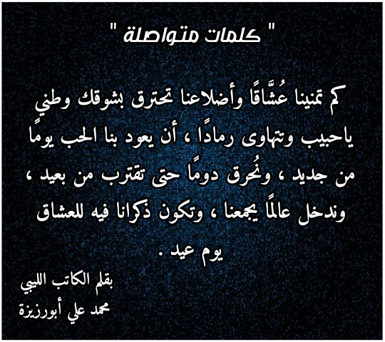 كم تمنينا عُشَّاقًا وأضلاعنا تحترق بشوقك وطني ياحبيب وتتهاوى رمادًا ، أن يعود بنا الحب يومًا من جديد ، ونُحرق دومًا حتى تقترب من بعيد ، وندخل عالمًا يجمعنا ، وتكون ذكرانا فيه للعشاق يوم عيد .