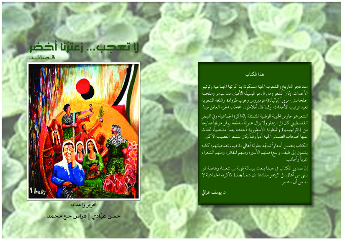 صدر في حيفا بالتزامن مع الذكرى الخامسة والأربعين لمجزرة تل الزعتر كتاب قصائد “لا تعجبْ زعترنا أخضر”، أعده وحرره الأستاذ المحامي حسن عبّادي والكاتب فراس حج محمد، ويقع الكتاب في (114) صفحة من القطع المتوسط. أشرف عليه فنيا الفنان الفلسطيني ظافر شوربجي، صاحب دار مجد للتصميم والفنون، وكانت لوحة الغلاف للطبيب د. يوسف عراقي الذي كتب أيضا على الغلاف الأخير للكتاب كلمة قصيرة ختمها بقوله: “إنّ صدور الكتاب في حيفا يبعث برسالة قوية إلى شعبنا، وخاصة لمن تبقّى من أهالي تل الزعتر مفادها: إن شعباً يحفظ ذاكرته الجماعية لا بد من أن ينتصر”.