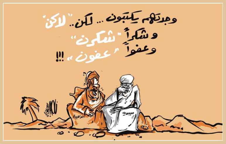 في اعتقادي الشخصي لم يخطئ الصفدي وهو يستشهد بالآية القرآنية، كما أن عبد الله الشيخ لم يخطئ في البيان، لكن كما هو في الكاريكاتير الذي يبدو فيه أن سيبويه على حق، وهو يرى ما يرى من تبديل التنوين نوناً. لكن، ليس هذا هو وقت التصحيح والتبيين على الملأ، على الرغم من أن الصفدي كان يستشهد، وجاء بالآية مثلاً، ولا يشترط في المثل إلا مطابقة الحالة العامة، لا التفاصيل الصغيرة. ثمة ما هو أهم من هذا التصحيح غير الضروري فيما ظنه “الشيخ” انحرافا تأويليا لآيات الله، ونحمد الله أنه لم يكفّره على “سوء التحريف”، فقد كفر بعضهم آخرين على أقل من هذا.