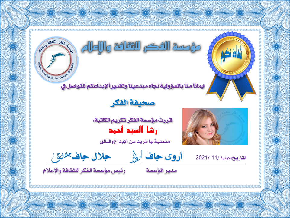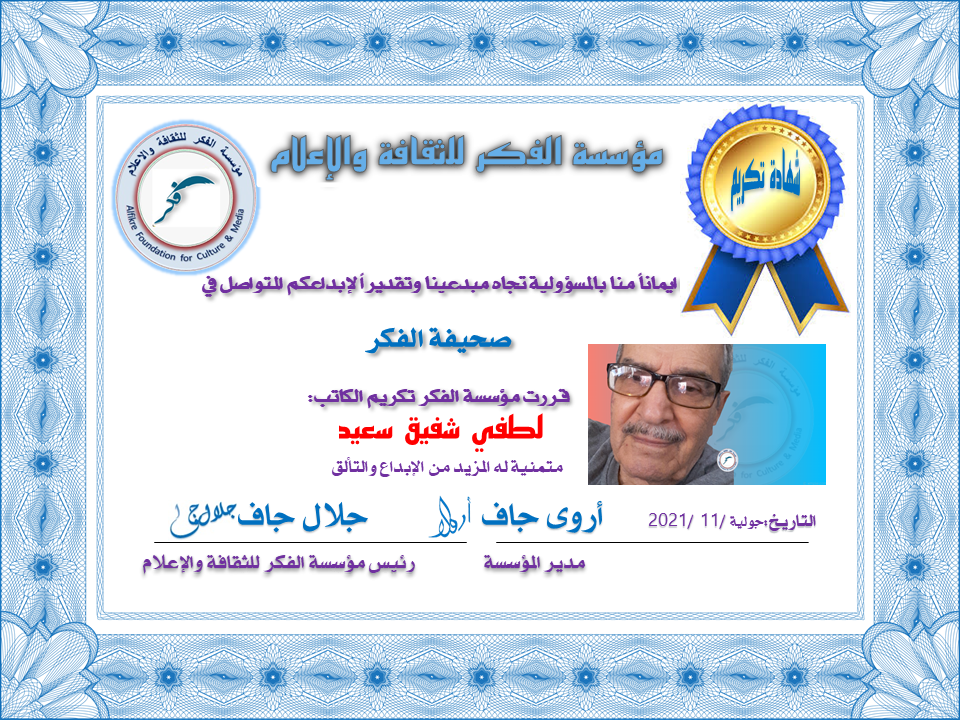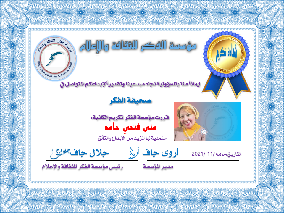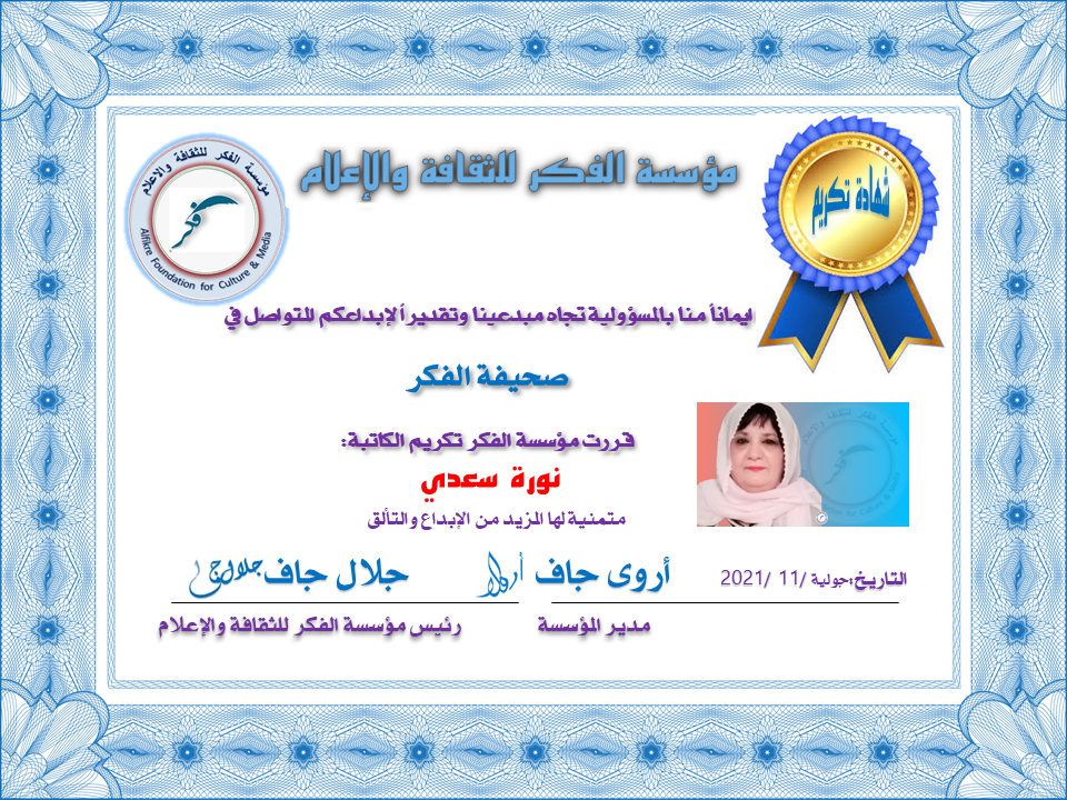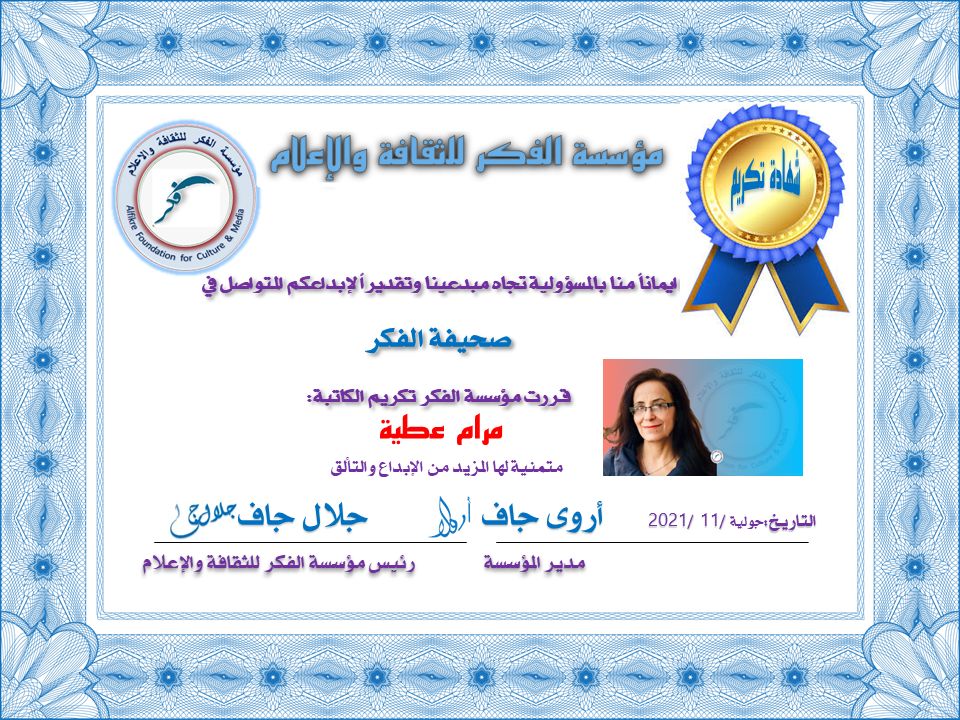 الألقة و المترجمة المبدعة الدكتورة أروى الشريف جاف والبروفسور الشاعر ا الأزرق لفذ جلال جاف على التكريم وسام المحبة الذي قلدتما به كتاب وكاتبات صحيفة فكر راجية المولى جل وعلا أن يوفق الجميع للمزيد من العطاء النير لنسمو بالثقافة العربية يما يخدم قضايانا وقضايا الانسان في كل مكان وفي الختام يسعدني أن أقلدكما أيضا وسام العرفان لما تبذلانه ومن معكما من جهد جبار لاخراج نصوصنا في أبهى حلة و ألف تحية و تقدير لسهر كل من في مؤسسة الفكر للثقافة والاعلام على التطوير المستميت للموقع ليستقطب خيرة المبدعين في كافة فنون الادب و الثقافة و المعرفة
