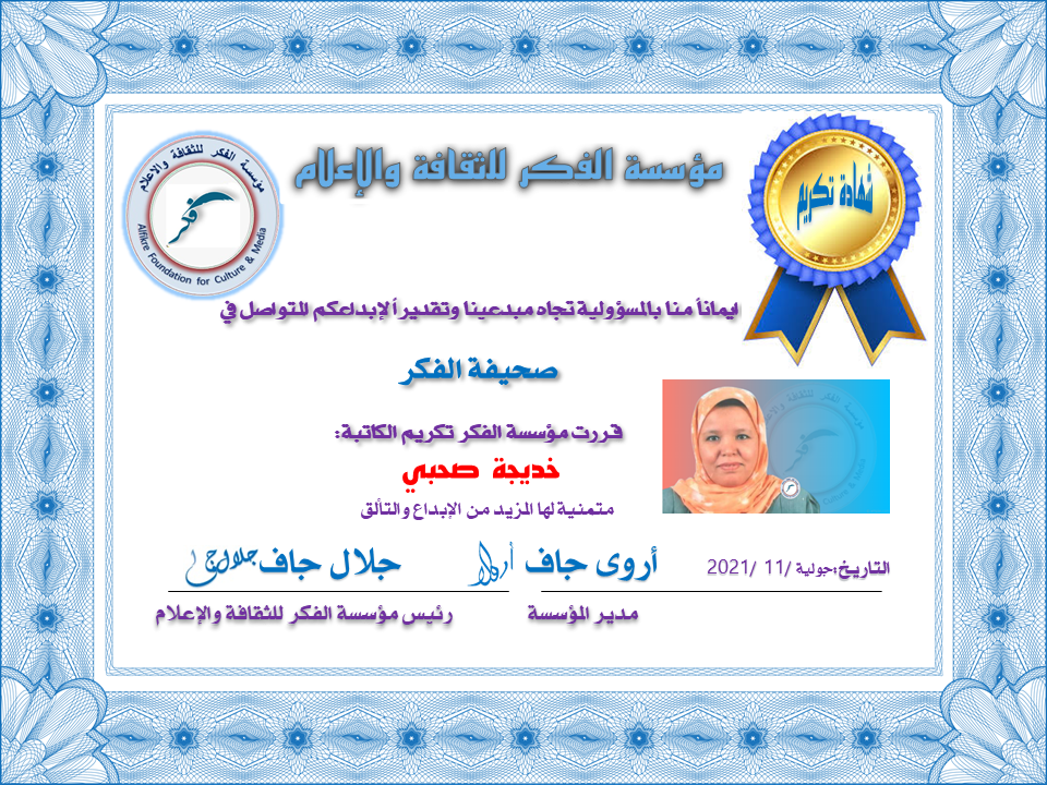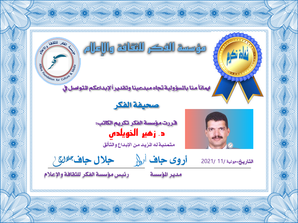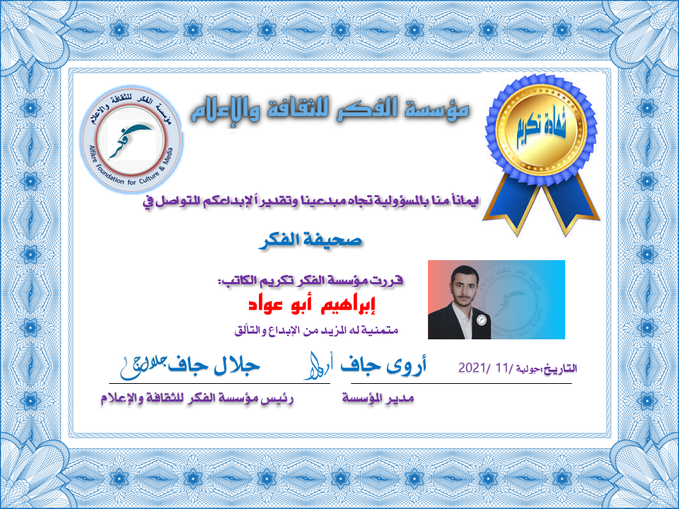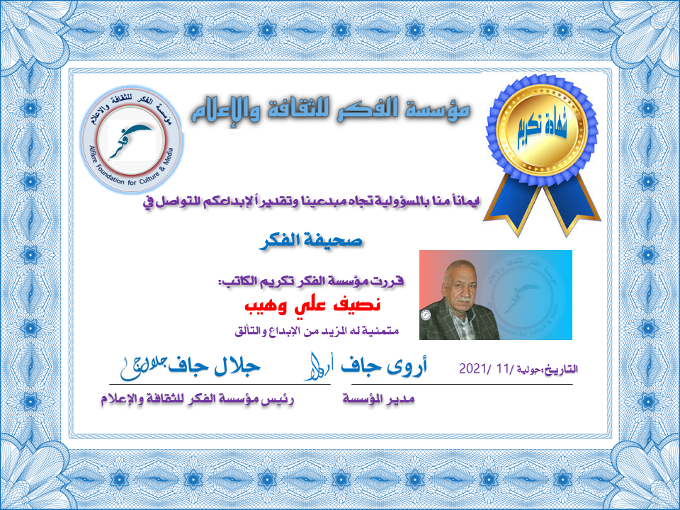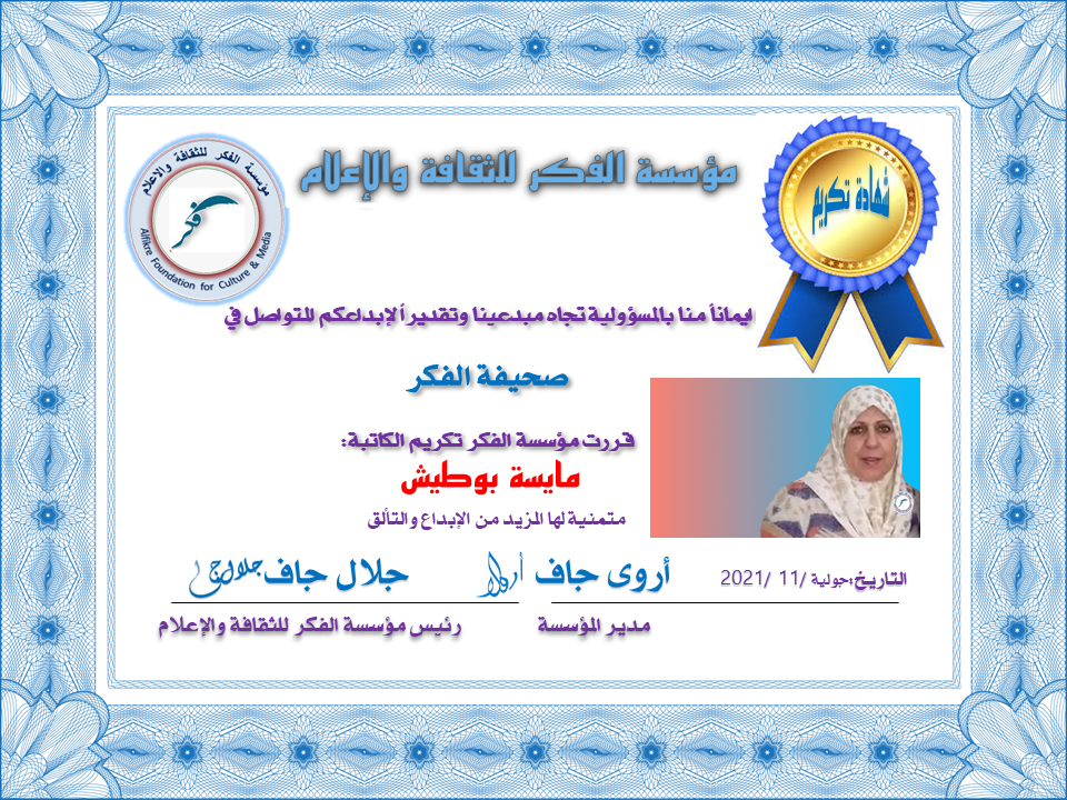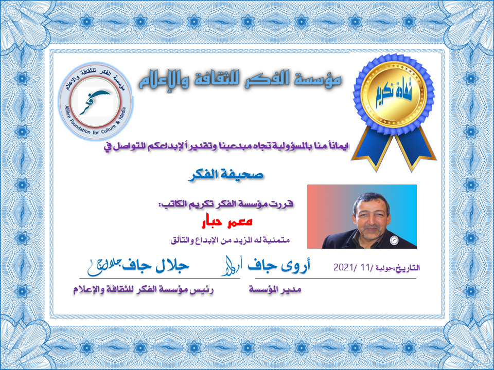 الألقة و المترجمة المبدعة الدكتورة أروى الشريف جاف والبروفسور الشاعر ا الأزرق لفذ جلال جاف على التكريم وسام المحبة الذي قلدتما به كتاب وكاتبات صحيفة فكر راجية المولى جل وعلا أن يوفق الجميع للمزيد من العطاء النير لنسمو بالثقافة العربية يما يخدم قضايانا وقضايا الانسان في كل مكان وفي الختام يسعدني أن أقلدكما أيضا وسام العرفان لما تبذلانه ومن معكما من جهد جبار لاخراج نصوصنا في أبهى حلة و ألف تحية و تقدير لسهر كل من في مؤسسة الفكر للثقافة والاعلام على التطوير المستميت للموقع ليستقطب خيرة المبدعين في كافة فنون الادب و الثقافة و المعرفة